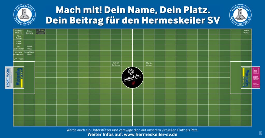 Platzpatenschaft Werde Platzpate beim Hermeskeiler SVSie hatten schon immer den Traum vom eigenen Stück Rasen auf dem Sportplatz? Mit einer Platzpatenschaft können Sie nun die symbolische Pacht über ein Stück Rasenfläche übernehmen. Unterstützen Sie so mit ihrem Beitrag den Hermeskeiler Sportverein und den Erhalt des Waldstadions.Was fördert die Patenschaft ? Die Erlöse aus den Platzpatenschaften kommen in erster Linie der Pflege und Instandhaltung des Rasenplatzes im Waldstadion des Hermeskeiler SV zugute. Was hat der Pate davon ?Alle Paten werden namentlich auf der „Platzpatenschafts Ehrentafel“ und auf der Website des Hermeskeiler SV genannt und öffentlich präsentiert. Bei jedem Heimspiel kann der Pate mit „seinem“ Stück Sportplatz prahlen.Werde auch ein Unterstützer und verewige dich auf unserem Virtuellen Platz als Pate. Wir würden uns sehr über eure Unterstützung freuenDie Preise berechnen sich wie folgt:16er = á 500 EuroEinzelfeld = á 35,00 Euro (Mehrfach Belegung möglich)Bankverbindung:Volksbank Trier-Eifel eGIBAN: DE50 5866 0101 0103 9630 72BIC: GENODED1BITVerwendungszweck: Name/Firma + Anzahl Felder(ab 200 Euro wird eine Spendenquittung ausgestellt. Unter 200 Euro gilt der Einzahlungsbeleg als Nachweis) Hermeskeiler Sportverein 1921 e.V. Ansprechpartner: Tobias Gosert oder Dirk Faber E-Mail: tobias.gosert@hermeskeiler-sv.de dirk.faber@hermeskeiler-sv.de